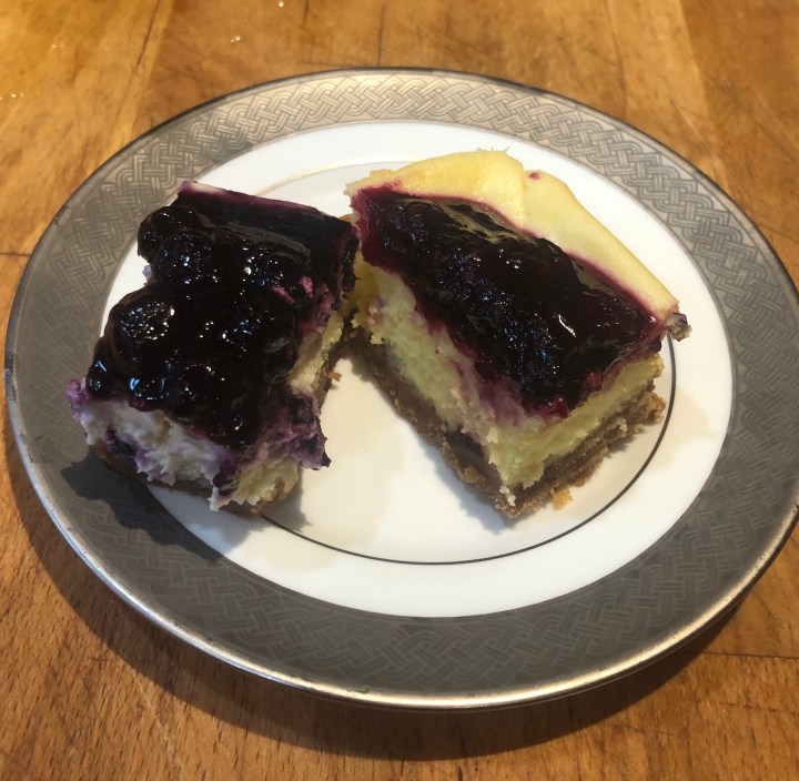 Now here was the challenging part for me. I didn’t want to serve these in the pans with the foil as I’d cut the foil with the cakes and people could (would) have foil attached to their bites. So I carefully used the foil to pull them out on to a counter, towards the edge. Took a plate and put the lip just under the edge of the cheesecake and carefully slide it forward by pulling on the foil until the cheesecake was all the way on the plate. Then I spread the fruit topping on it and chilled for an hour (or overnight, but cover it with wrap). Cut into bars and enjoy!