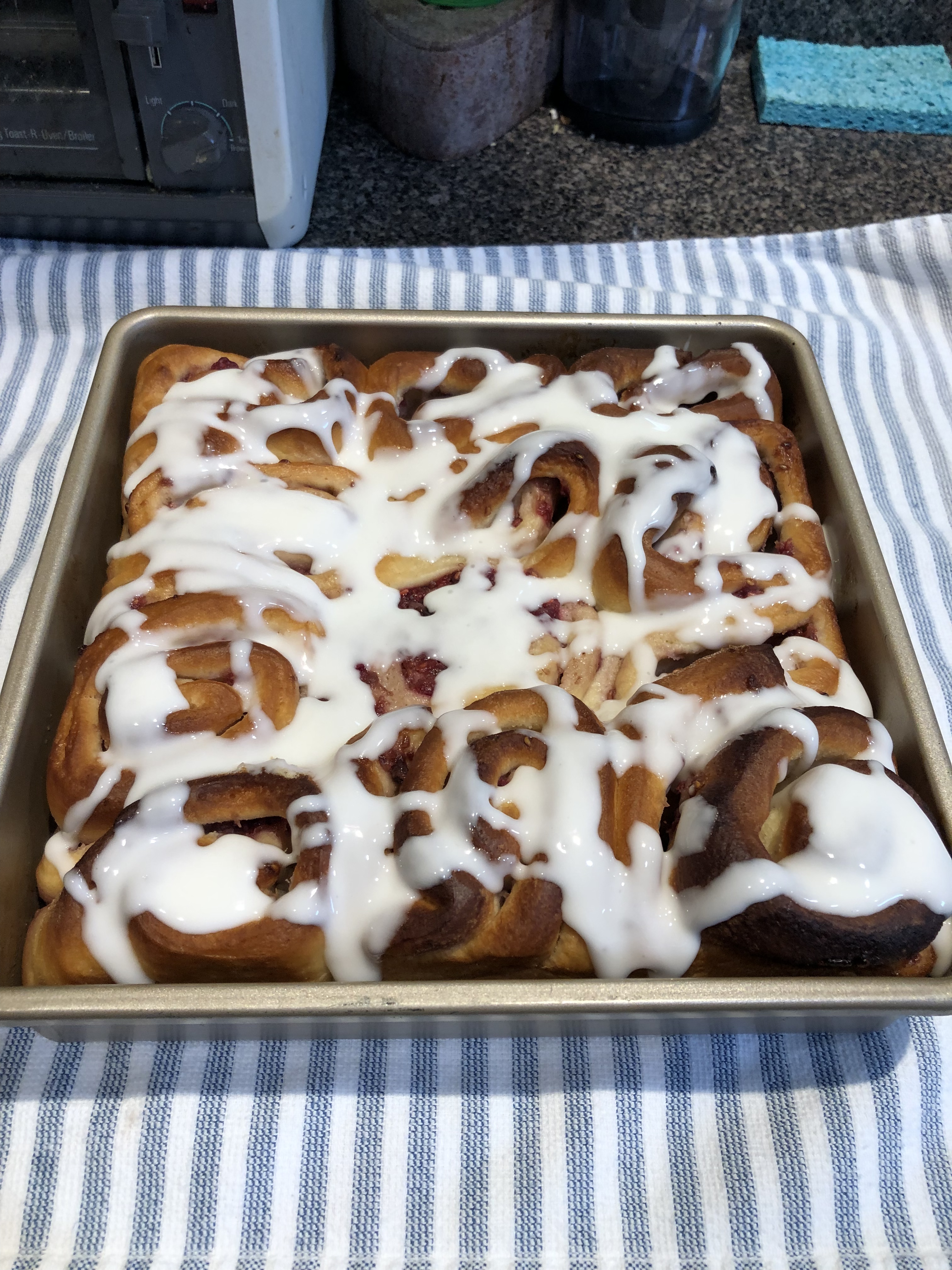 Starting with the long edge, roll the dough into a 20″ log. Take a 9×13″ pan and spray with non-stick cooking spray (or you can butter it is you want the additional flavor). Cut the dough into roughly 2 to 2.5″ slices and put them cut side down in the pan. Raspberry will inevitably ooze out, scoop it up and put in on top of the rolls. It’ll be fine.